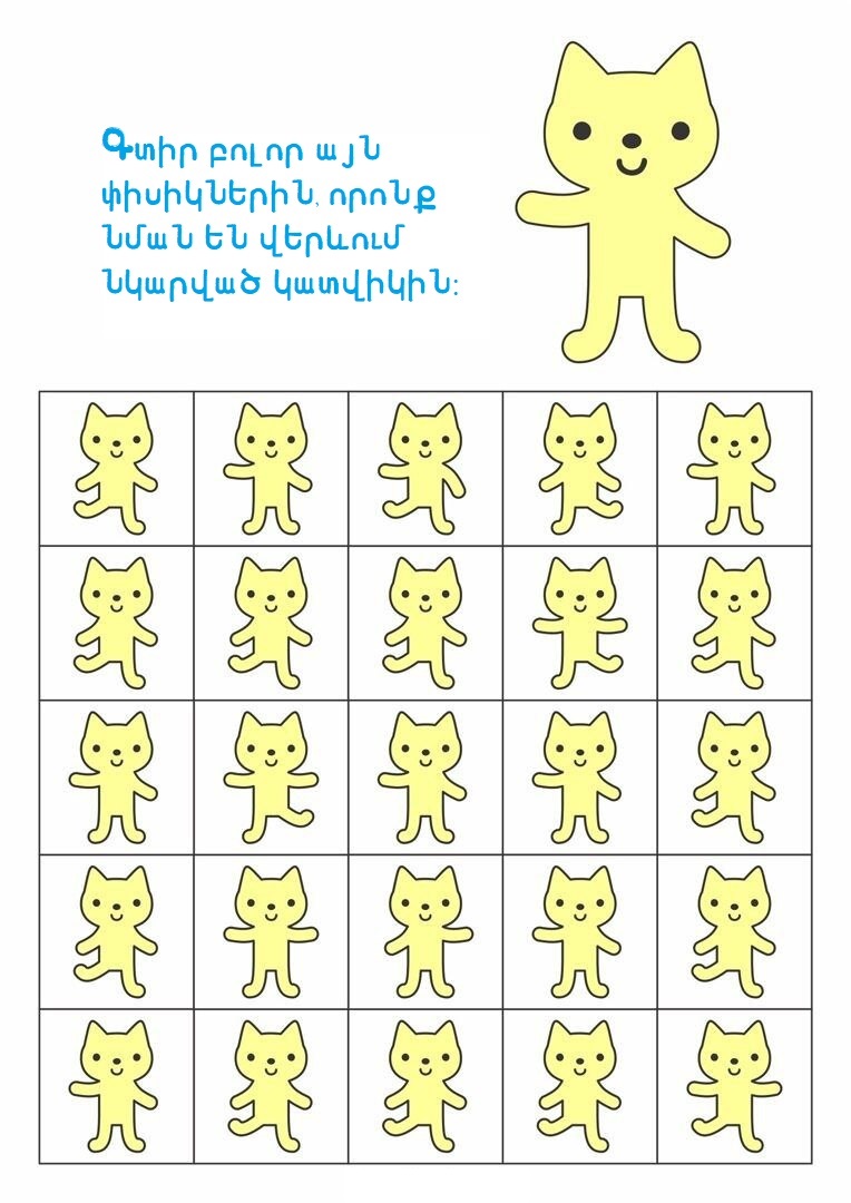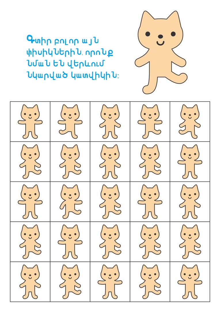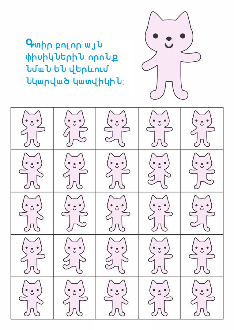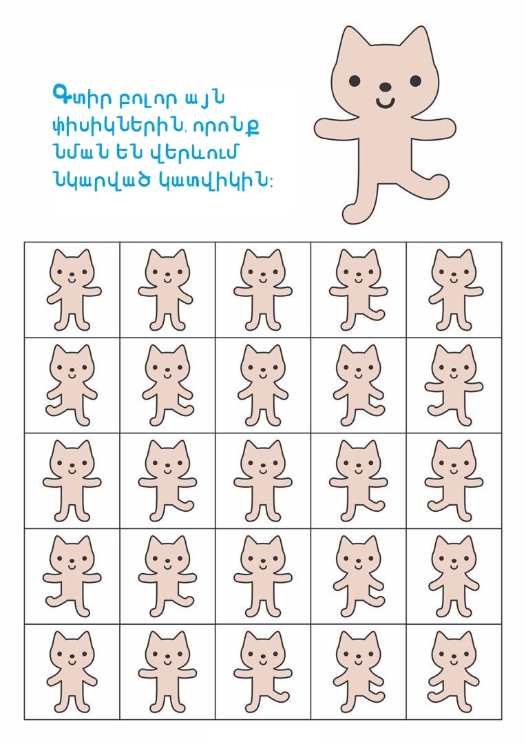 3-5 տարեկաններԳլուխկոտրուկներԳտիր տարբերությունը կամ նմանությունըՄտքի զարգացում Գտիր պարող փիսիկներին 16/10/2025 0 38 FacebookTwitterPinterestWhatsApp Սիրելի փոքրիկ, ուշադիր նայիր նկարներին և գտիր այն փիսիկներին, որոնք նման են վերևում պարող կատվիկին։