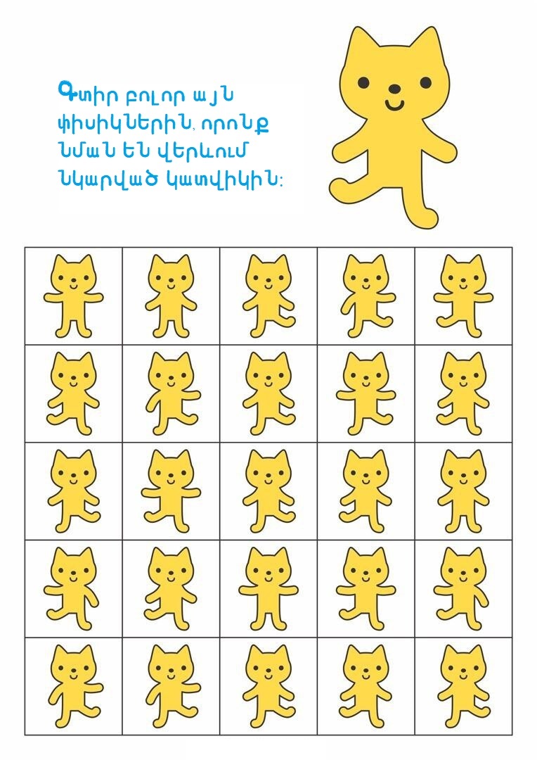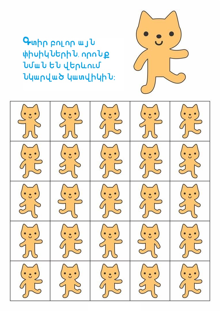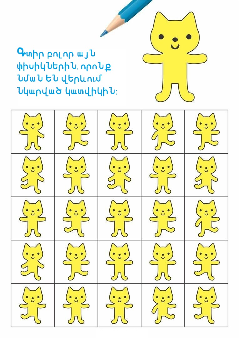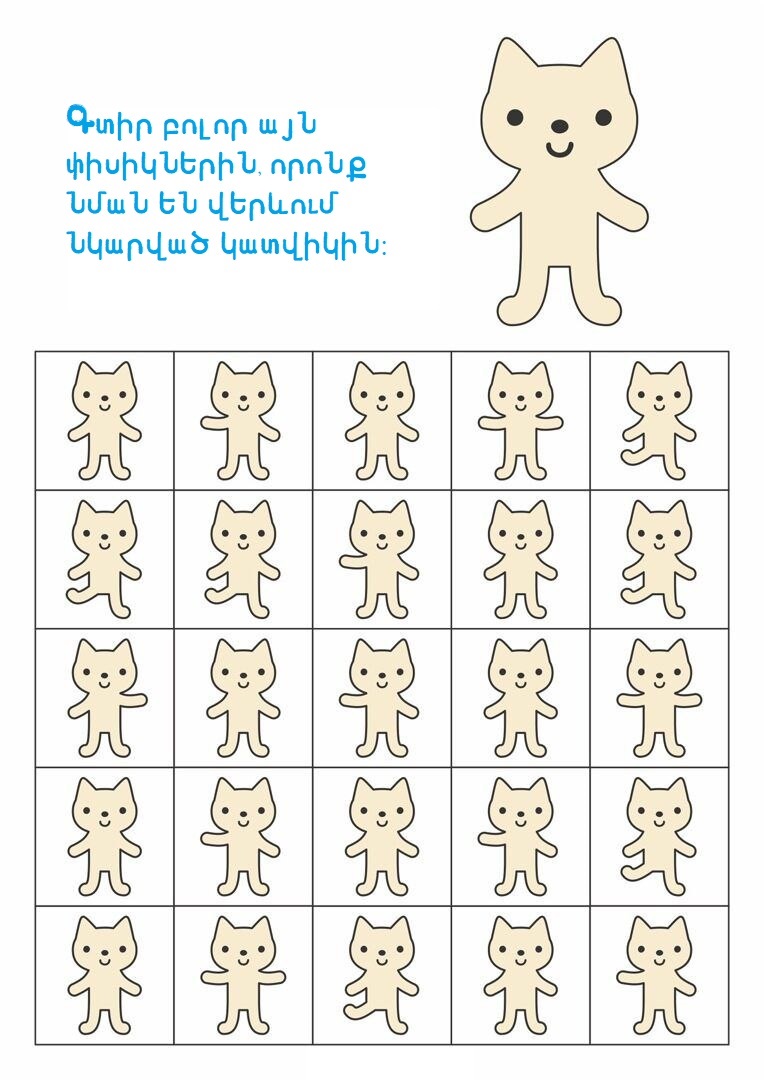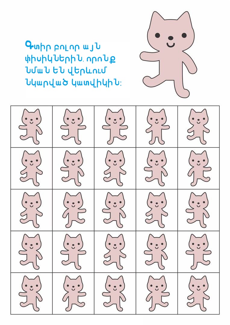 3-5 տարեկաններԳլուխկոտրուկներԳտիր տարբերությունը կամ նմանությունըՄտքի զարգացում Գտիր պարող փիսիկներին 16/10/2025 0 38 FacebookTwitterPinterestWhatsApp Սիրելի փոքրիկ, ուշադիր նայիր նկարներին և գտիր այն փիսիկներին, որոնք նման են վերևում պարող կատվիկին։